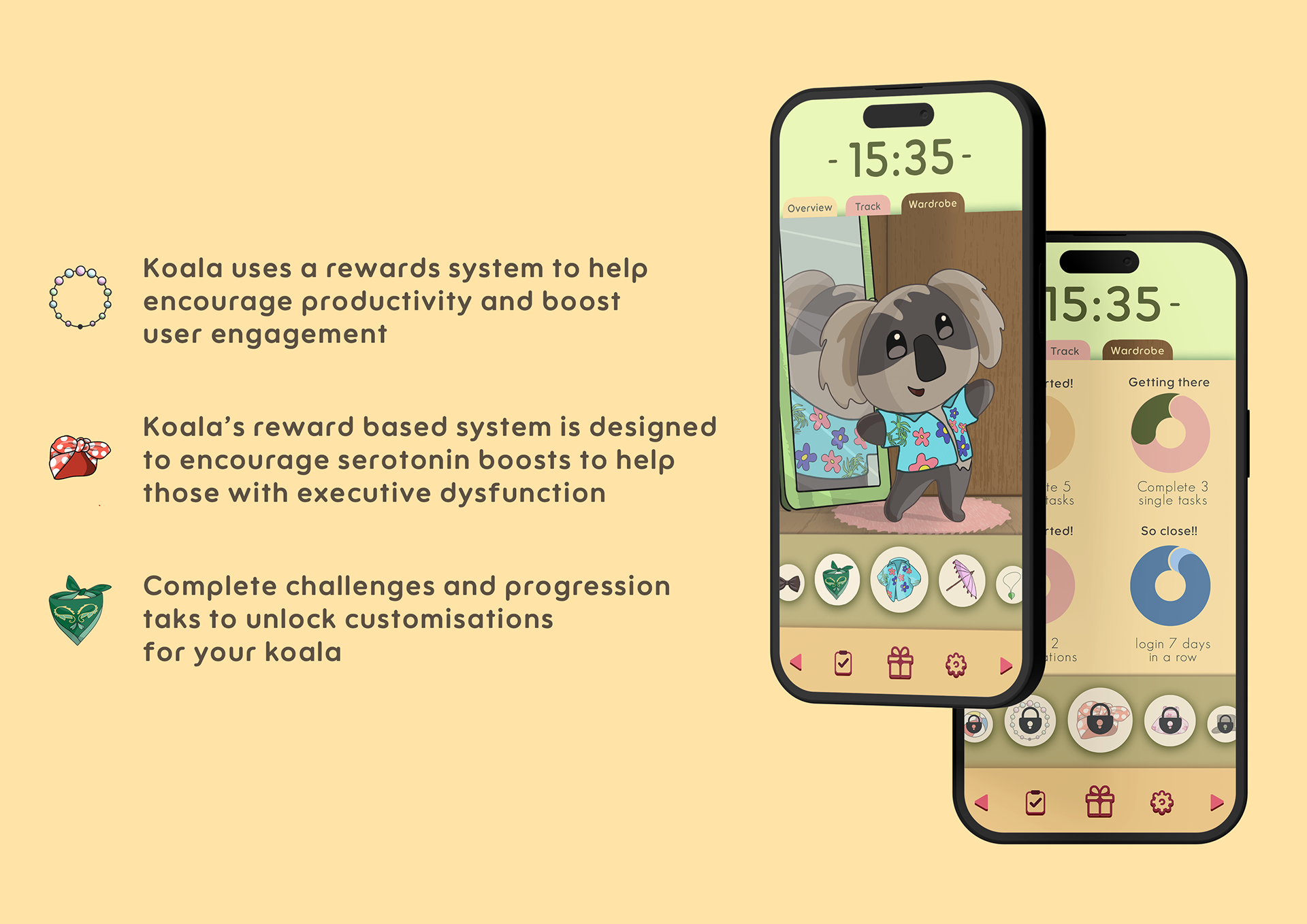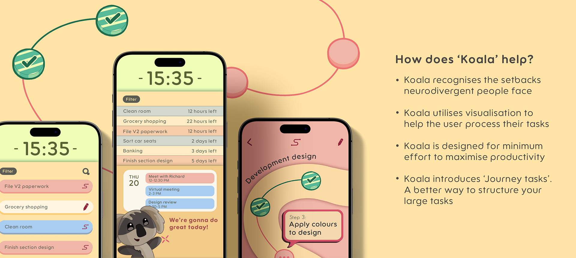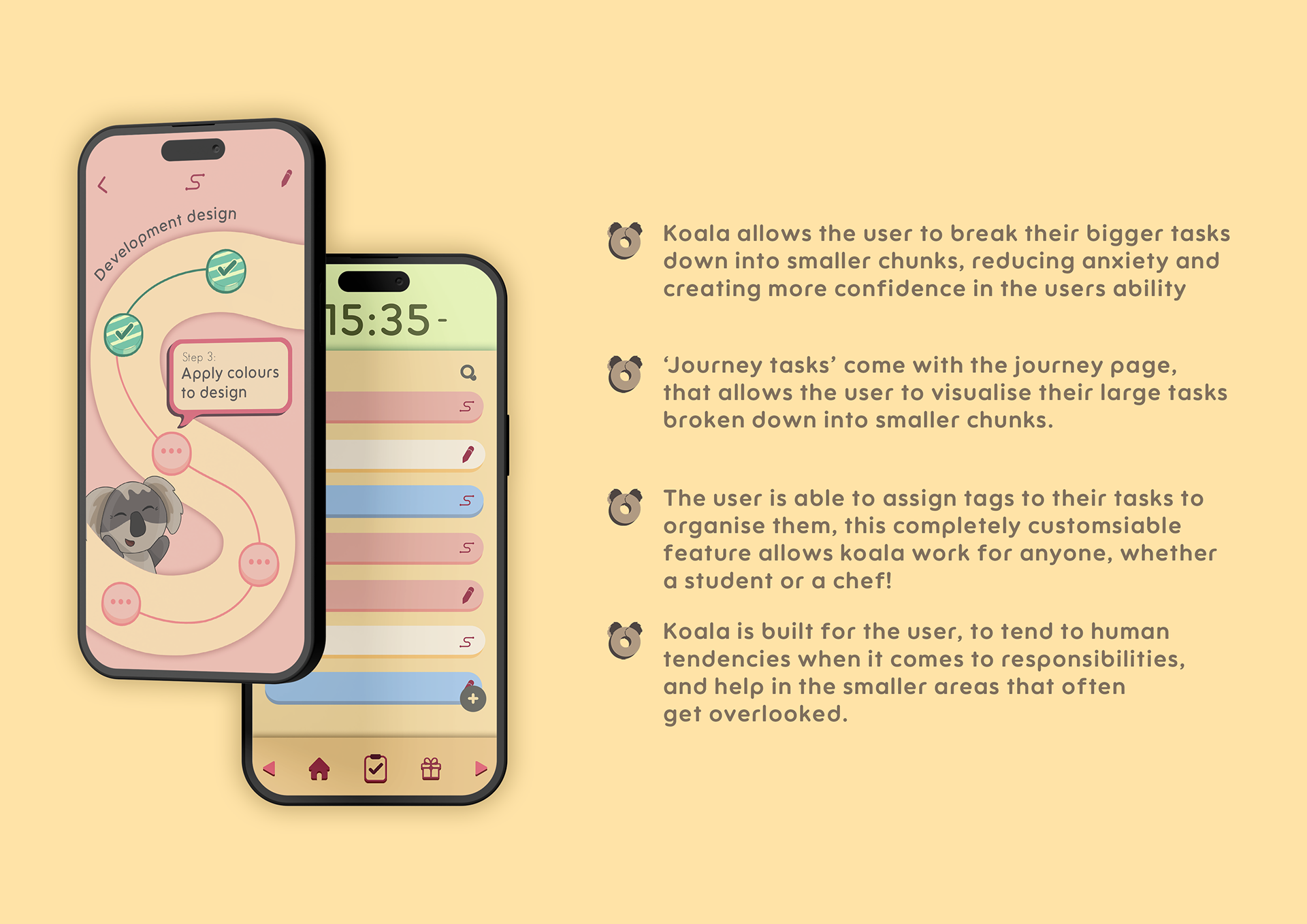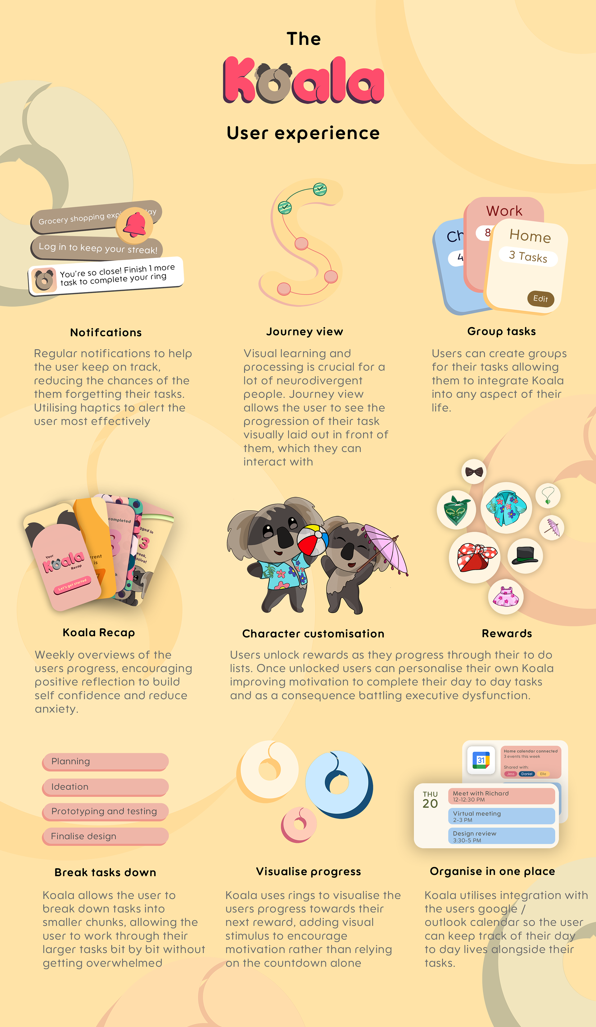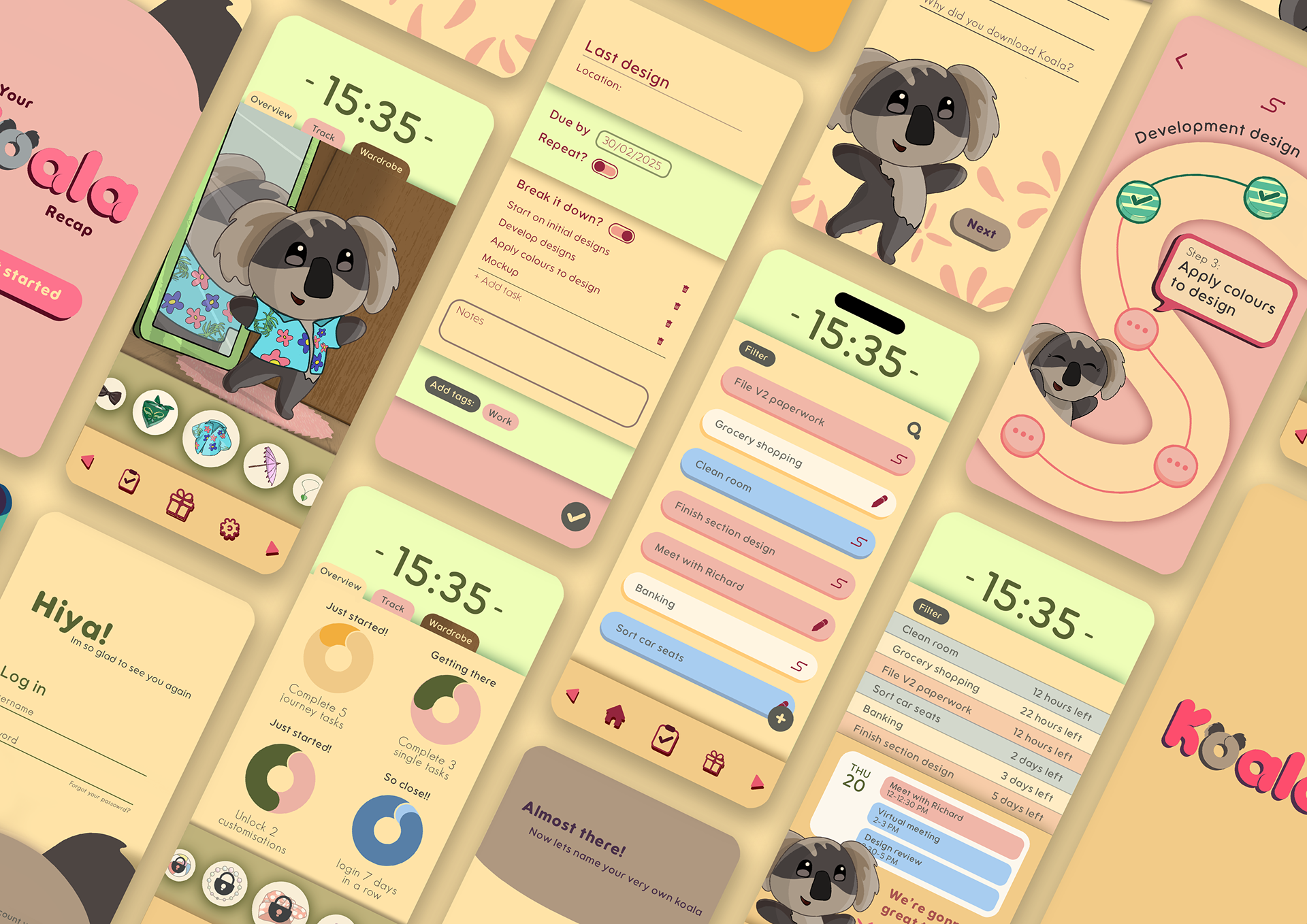Koala is an app I designed as one of two final projects for my BA in Graphic design. It focuses on helping neurodivergent people with time management.
