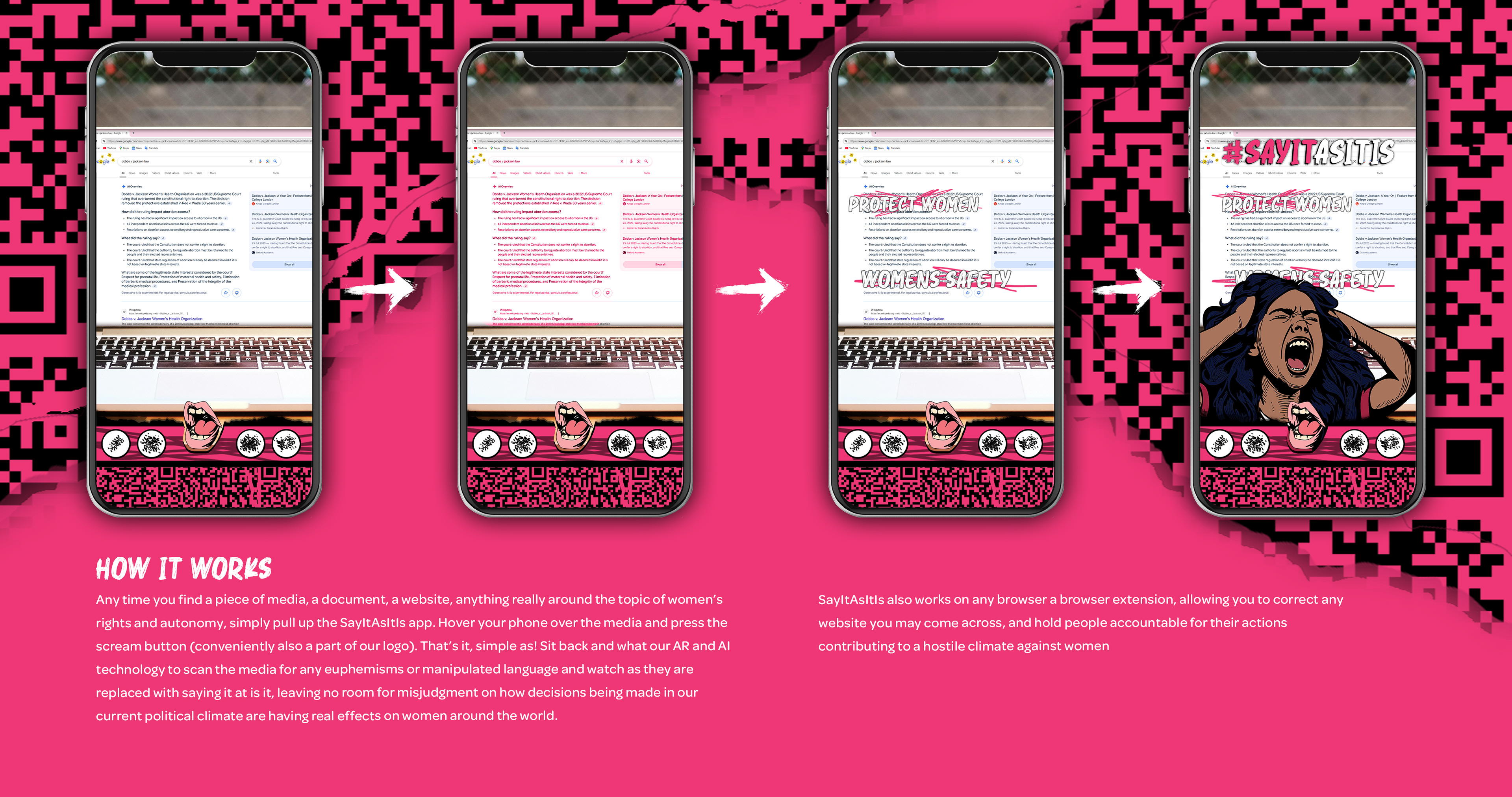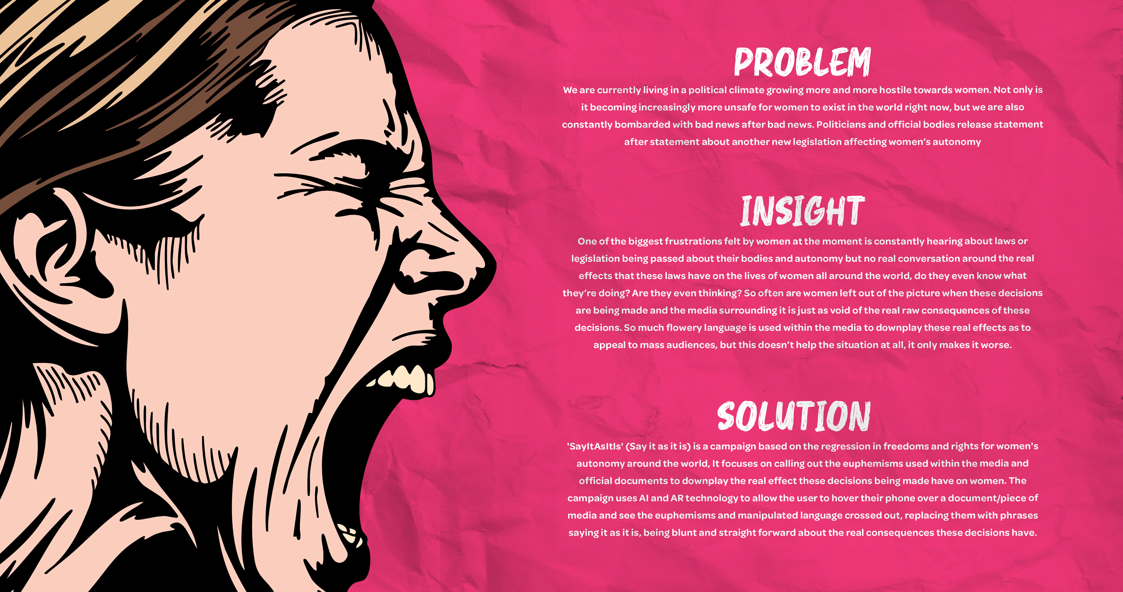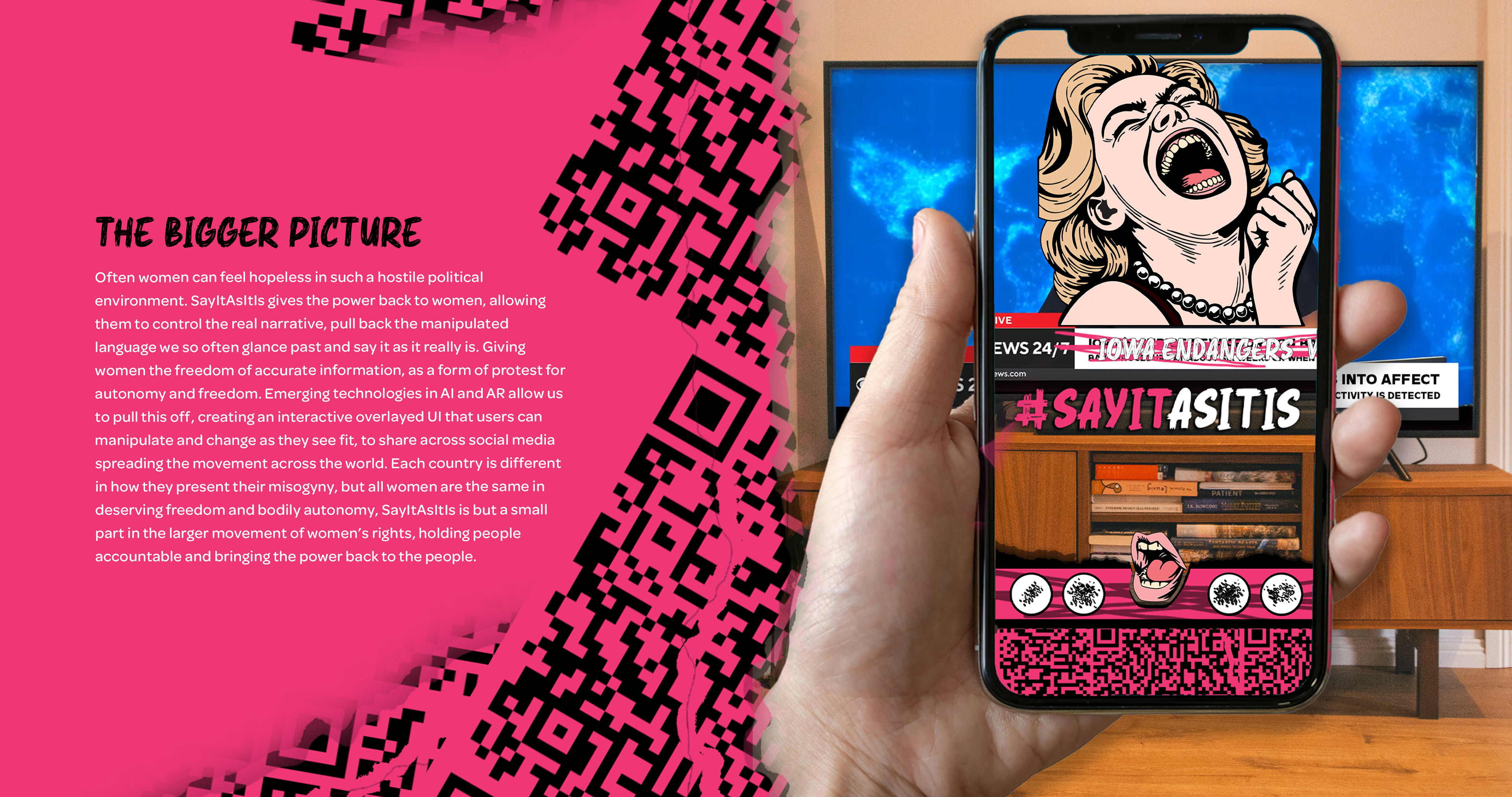 SayItAsItIs (Say It As It Is) is my response to the 2025 Monotype D&AD brief. The project utilises strateigic brand design and motion graphics to create a compelling and highly participatory campaign to uplift women in hostile political climates